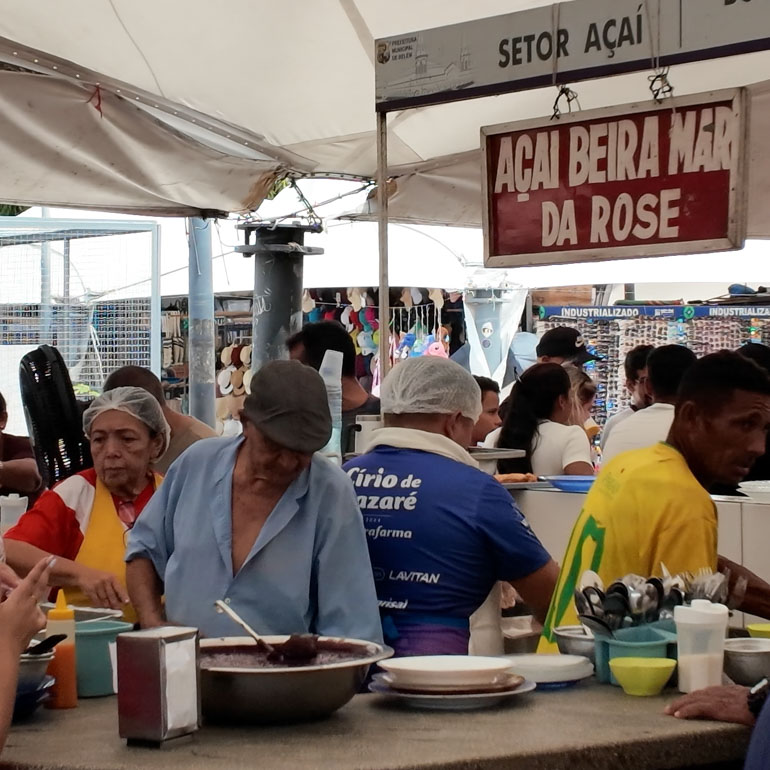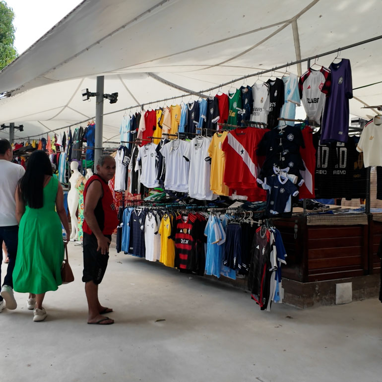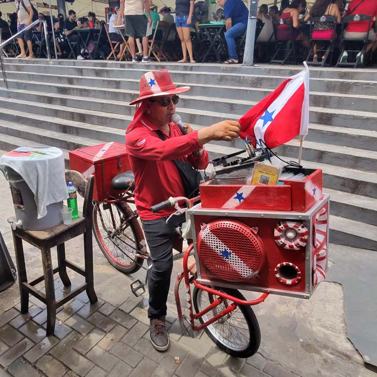 At Ver-o-Peso, even advertising becomes a performance. A roaming market announcer pedals through the crowd with a bicycle-mounted sound system, calling out prices and promotions for nearby vendors. Dressed in the red and white of Pará’s state flag, he’s part salesman, part showman—and part of the constant soundtrack that gives the market its unmistakable character.