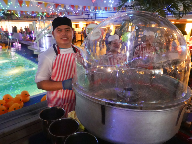 As you play, you earn raffle tickets; better results earn more tickets. At 9:15 p.m., the tickets are drawn for prizes ranging from logo merchandise to specialty dining.