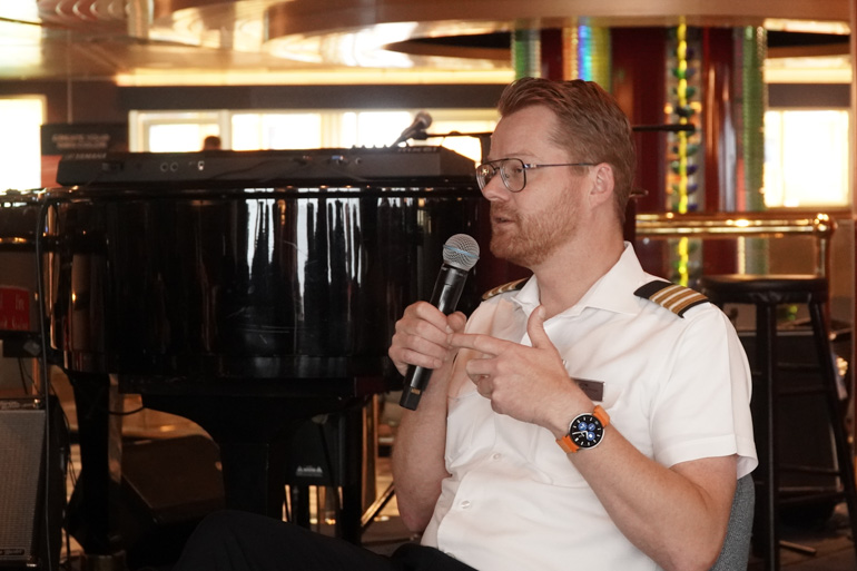 At 10 a.m., I headed to the Ocean Bar for the daily Coffee Chat, hosted by Cruise Director Jayme McDaniel. His guest this morning was Ron Houtman, the ship’s Food and Beverage Director.