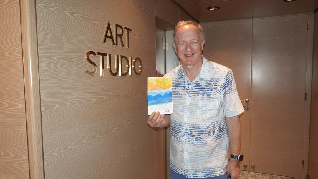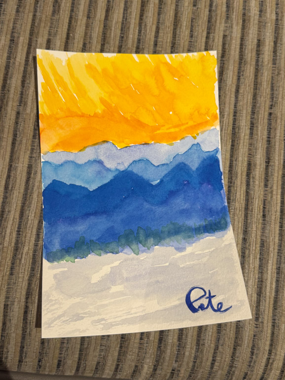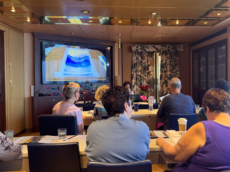Later in the morning, I stopped by the Watercoloring Class at 11:30 in the Art Studio. The room was nearly full, but I managed to find a seat in the center. Today’s theme was Landscape: Mountains.
