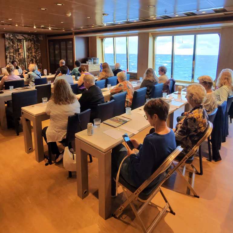A relaxing day at sea before reaching the Azores, featuring coffee chat insights, watercolor creativity, and a lively musical performance on the World Stage
