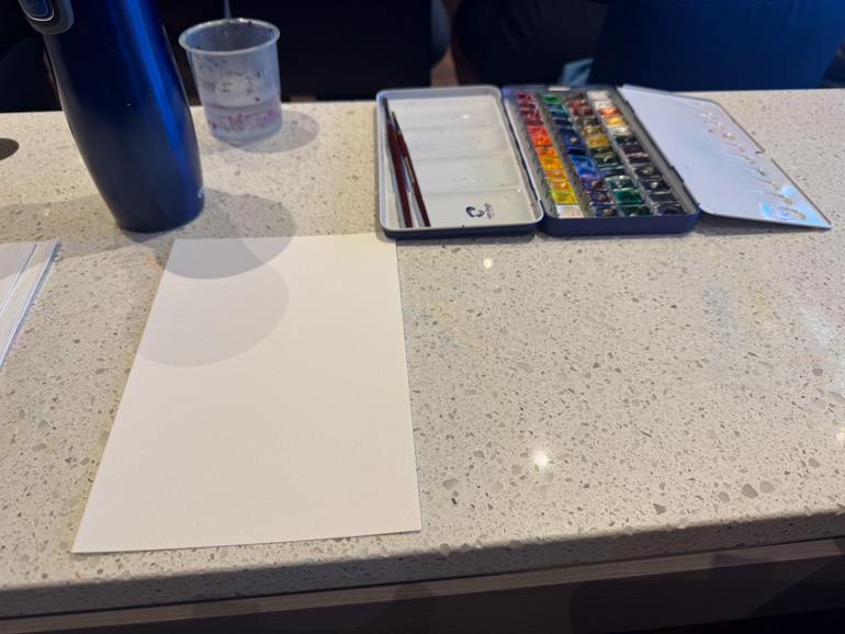 The instructor displayed the example painting at the front and encouraged us to take a quick photo on our phones for reference. Each person had two brushes and shared a watercolor palette with their neighbor. The instruction focused mainly on composition and the recommended order for painting, rather than color mixing or brush techniques — so a bit of prior experience was helpful.
