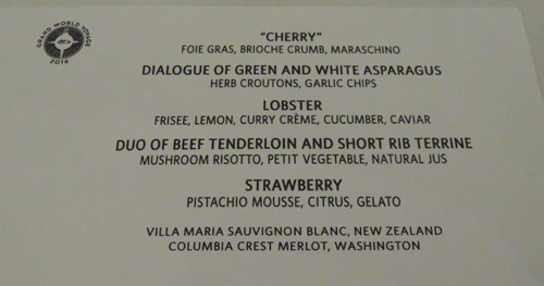 Half of our table was invited to the 3rd Captains dinner of the Cruise. Everyone on the full world cruise will be invited sooner or later and the dinner takes place every Saturday if the ship is at sea. Below is a photo of the menu from tonight’s dinner. Starting at 6pm in the Pinnacle Grill, each dinner has a special menu that is not repeated. Our tablemates reported that the dinner was fabulous – it tasted great with an amazing presentation. Everyone also received a porcelain salt and pepper shaker with the Holland America Logo. We heard that preparation for this meal starts at 3am an continues throughout the day.
