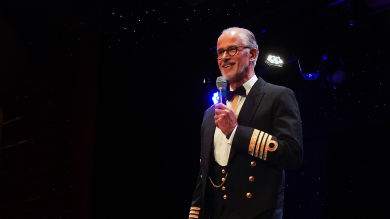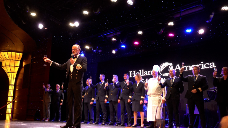 The Captain’s Welcome Aboard Toast took place at 7:00 p.m. in the World Stage. We arrived around 6:50 and found great seats in the third row — the theater never filled up. Sparkling wine was offered as guests entered, and the ship’s officers lined both sides of the starboard entrance on Deck 4, forming a receiving line.
