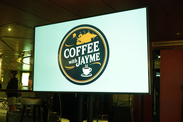 On previous cruises, Coffee Chat was a daily event. Jayme mentioned he’ll be hosting them periodically throughout this cruise — sometimes featuring interviews with crew members who work behind the scenes. He’ll also host Artist Chats in the afternoons, interviewing guest performers from the World Stage shows.
