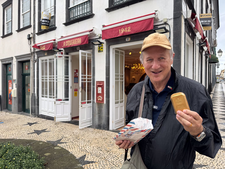 We made our way back toward the cruise terminal, stopping again at the Comur sardine shop to pick up a few tins (including swordfish and boneless sardines with edible gold flakes), and ducked into a small souvenir shop for keychains. Back aboard by 2:49 PM, we were both full and fulfilled.