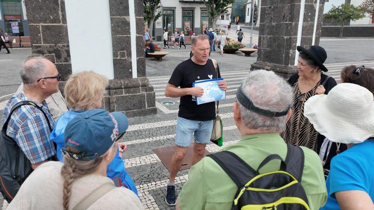 Our first pause was at Portas da Cidade, the triple-arched city gates of black basalt and white limestone that once marked the entrance to the walled town, now standing in Praça Gonçalo Velho Cabral. Marco shared a quick primer on Azorean geography and history — volcanic origins, settlement, and the islands’ strategic mid-Atlantic role.