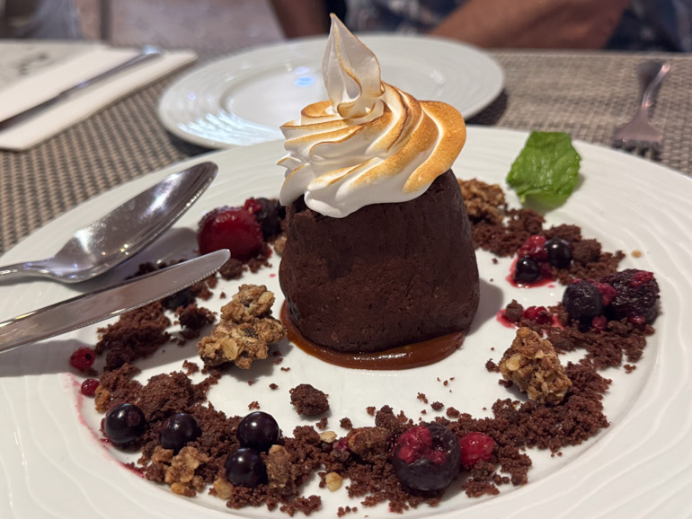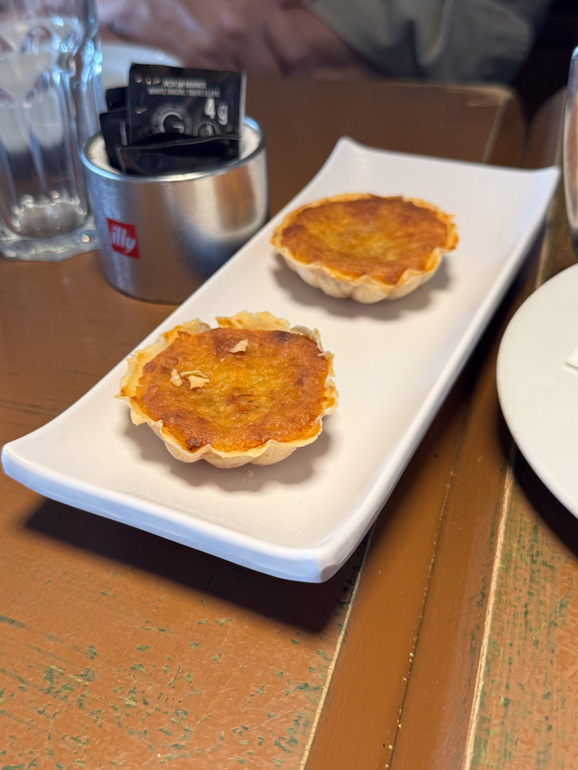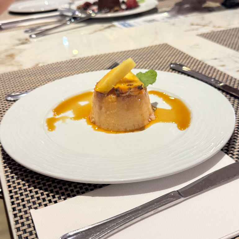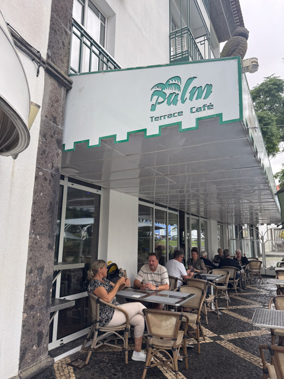 Our final stop was the Palm Terrace Café inside the Hotel Talisman. We were seated at a long indoor table where each couple would share one of the Vulcão do Fogo — chocolate, pineapple ice cream, caramel, toasted meringue, and berries — while others chose a dairly free option: Pudim de Ananás, a silky pineapple pudding with caramel sauce. Both were excellent.