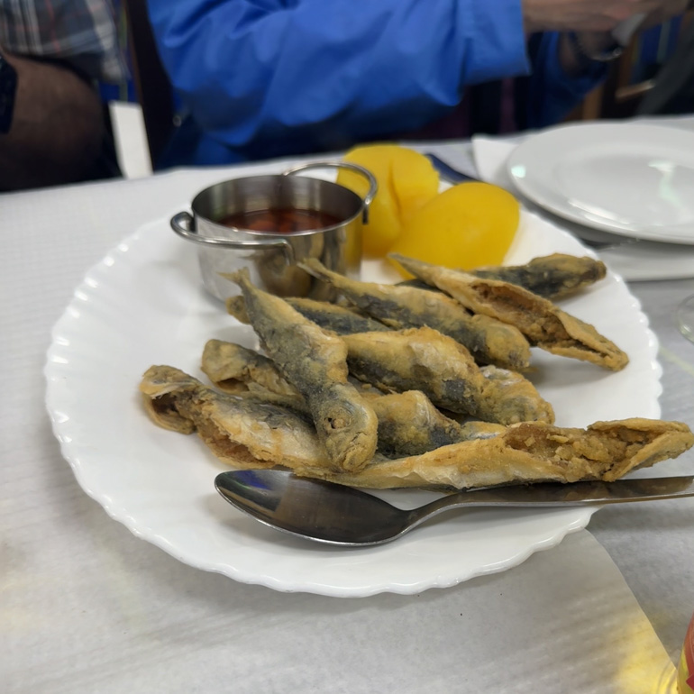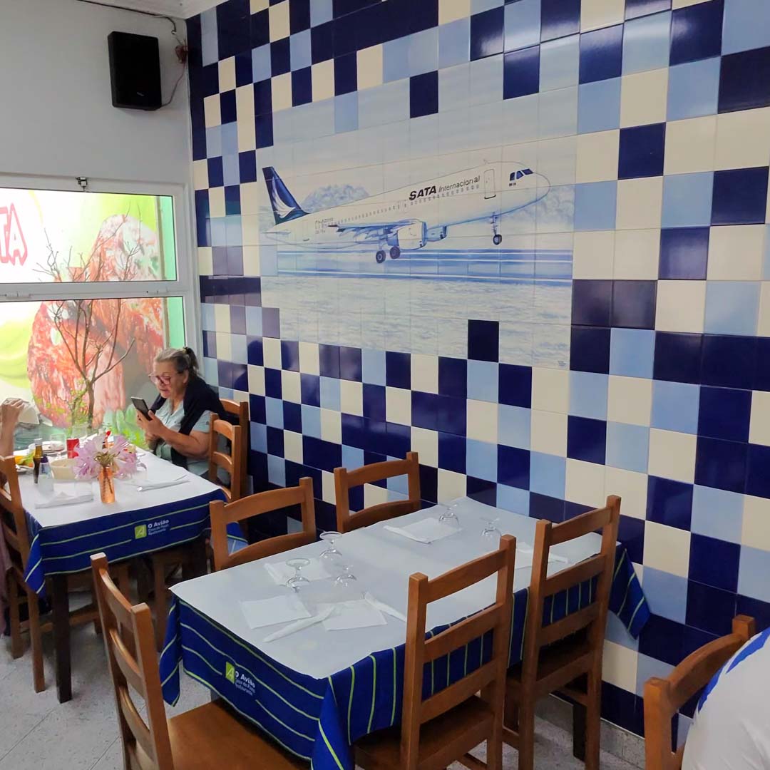 By early afternoon, we arrived at O Avião, an aviation-themed restaurant featuring airplane murals on the walls. Almost immediately, two trays of fried jack mackerel arrived — small fish served whole, crispy, and flavorful — plus a simple salad of tomatoes, lettuce, and mozzarella. The fish can be eaten whole, but some people cut off the heads or trimmed off some of the bones first.