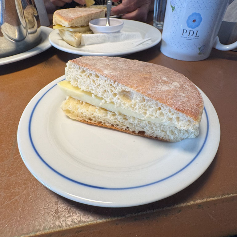 We were served a bolo lêvedo sandwich with queijo tipo Roda, a mild local cow ‘s-milk cheese similar to a young Gouda. The sandwich was served cold — simple, soft, and satisfying, with the faint sweetness of the bread perfectly balancing the cheese. Alongside it: a queijada (sweet cheese tart), an orange–pineapple–cinnamon pastry, and a cup of local black tea.