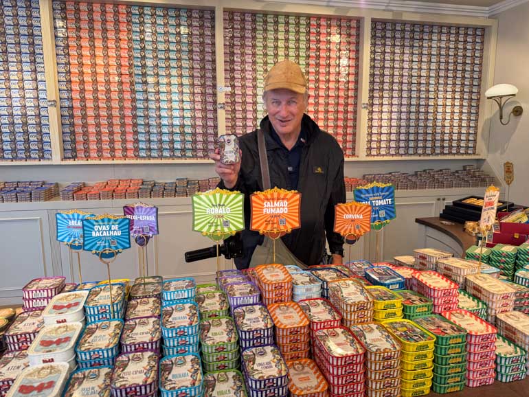 Pete in front of the Sardine shop with a Golden Sardine Tin – Sardines without bones or skin, garnished with edible gold flakes