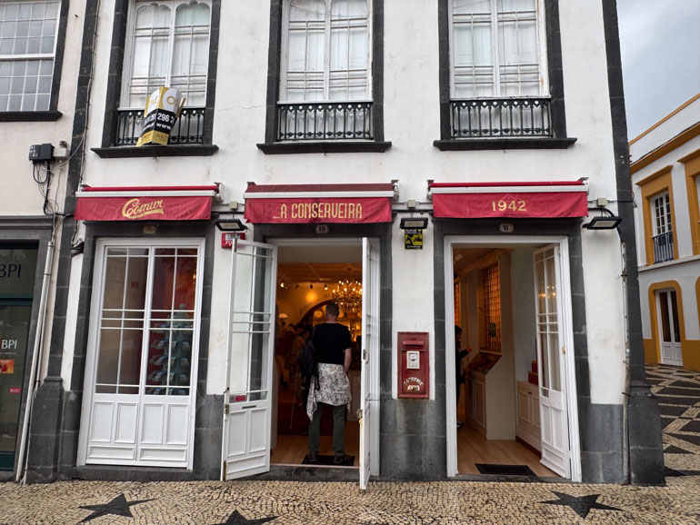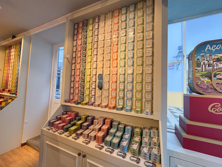 We continued back toward the center of town, passing the Igreja Matriz de São Sebastião, with its striking black-and-white basalt façade and 16th-century stonework. A few steps later, we reached the Comur — Conserveira de Portugal sardine shop, its walls glowing with rows of colorful tins — sardines, tuna, mussels, even swordfish — around €13.50 per tin. We admired but didn’t shop yet; we planned a return after our tour.