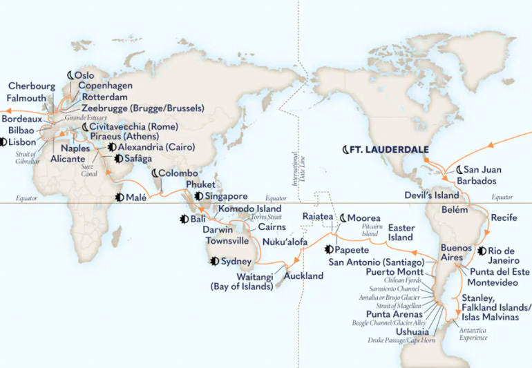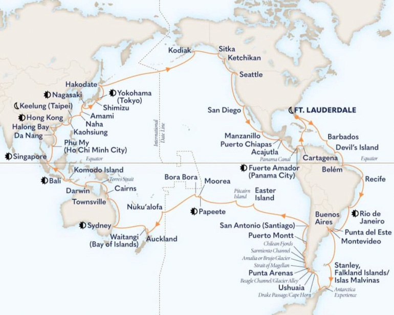 By the time we return to Fort Lauderdale on May 17, we will have sailed around South America, experienced Antarctica, crossed the South Pacific to Australia, looped through Southeast Asia and Japan, continued north to Alaska, cruised down the West Coast of the United States, and finally returned east via a Pacific-to-Atlantic Panama Canal transit.