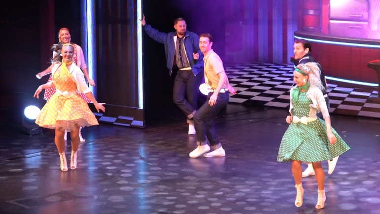 Tonight’s featured entertainment on the World Stage was the Repertory Company, performing their first of seven shows this cruise. The company consists of four singers — Scott, Charlotte, Alayna, and Kyle — and four dancers — Charlotte (number two), Kelly, Will, and Toby. The cast, all from London, are just beginning their run aboard and will be performing on the ship until May 17th next year.