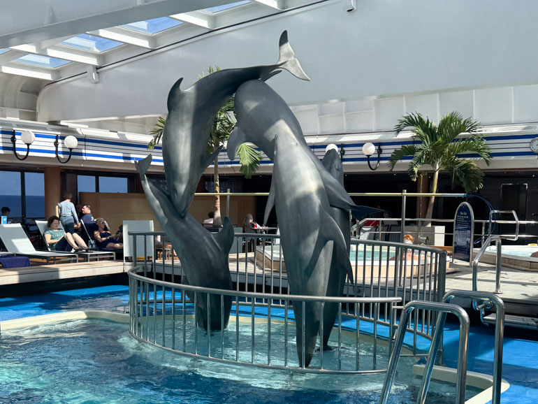 Today, I decided to listen to it, and the recorded narrators guided me throughout the ship. The full tour runs about 45 minutes and is still roughly 90% accurate. A few pieces are gone — particularly in areas that have been remodeled, like the Explorations Café and Piano Bar — but most of the collection remains in place. The narration provides a full guided route, describing where to go, which staircases to use, and what to look for at each stop. It even points out hidden sculptures that would be easy to miss otherwise and explains the meaning behind the five dolphins in the Lido swimming pool. It was a nostalgic and surprisingly informative walk.