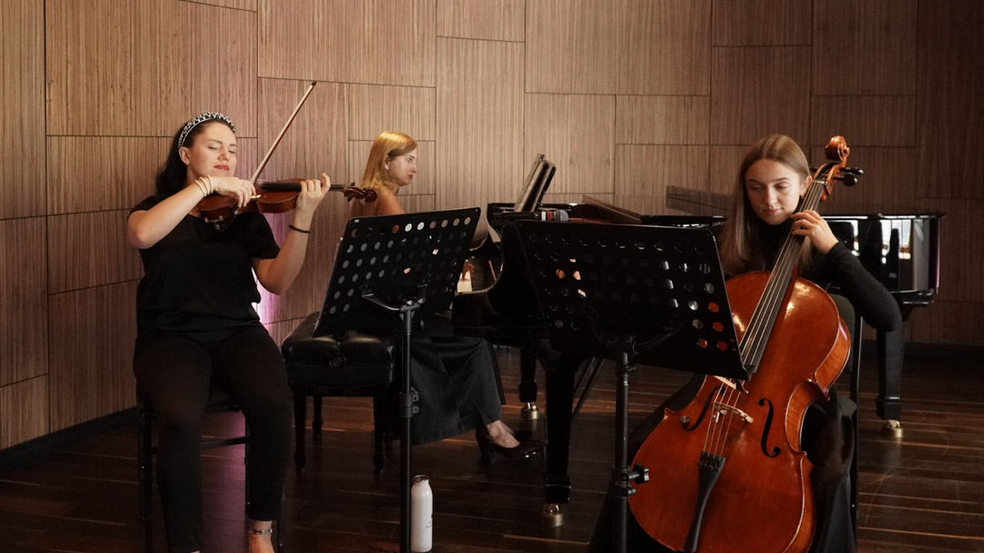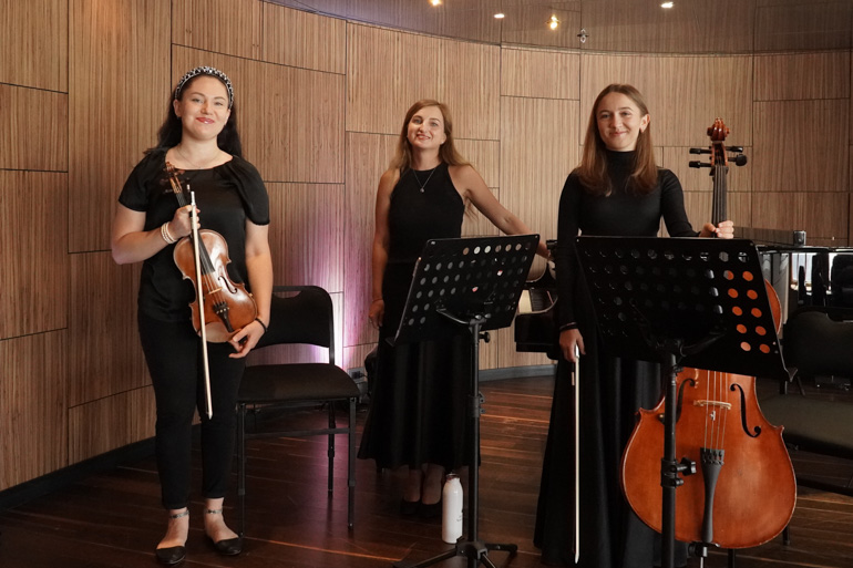 - Maria on violin, Olga on piano, and Iryna on the Cello