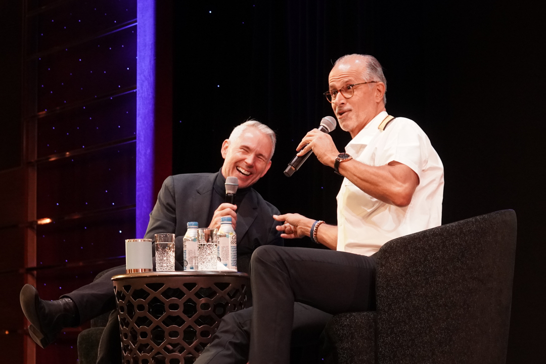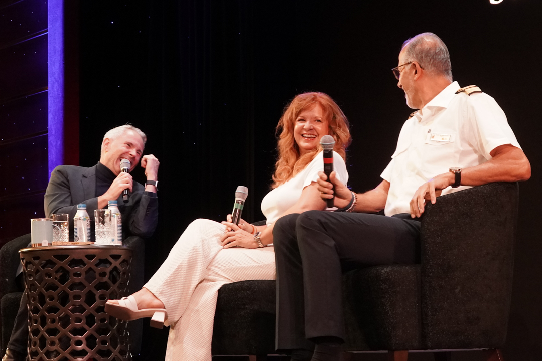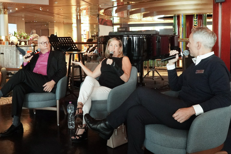 At 4:30 in the Ocean Bar, Jayme hosted Meet the Artists with comedian-magician Shawn McMaster and singer-comedian Tricia Kelly. They reminisced about meeting during resort contracts in 2013, the odd jobs that led to their careers on ships, and the family-friendly schedules. Shawn has been performing magic since the age of six; Tricia shifted from karaoke and a chance gig with Bill Medley into comedy and impressions. The chat was warm, funny, and very “showbiz randomness.”