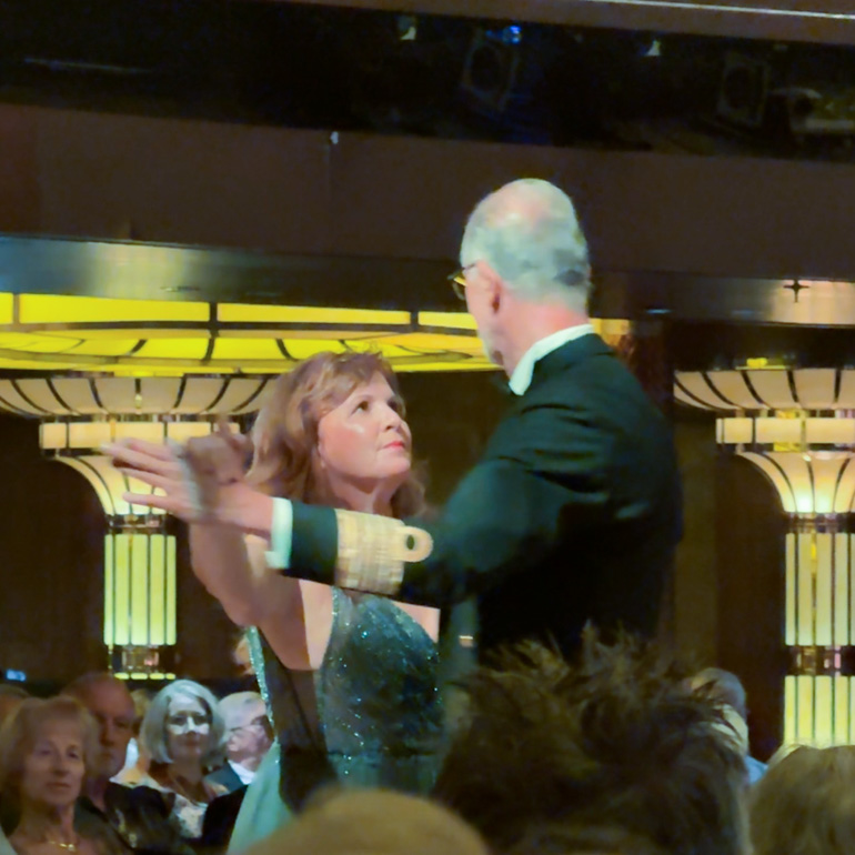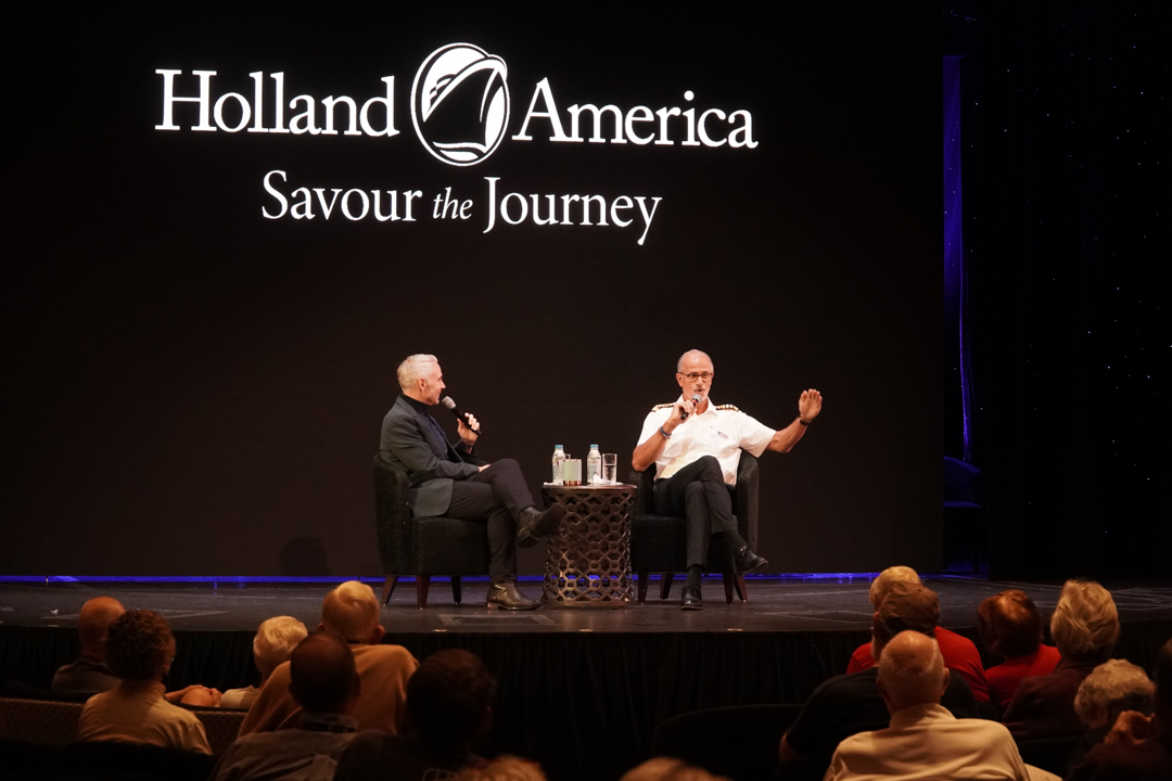 The day began with Coffee Chat, moved from the Ocean Bar to the World Stage to accommodate Captain Frank. Jayme’s interview covered the captain’s 2012 storm near the Falklands, his path from Dutch naval crossings to maritime academy, and years on tankers, ferries, and cargo ships before joining HAL in 1993. Spotting Alexandra in the audience, Jayme invited her up; she shared how they met on a cruise—Frank joked he was “in charge of dishwashers,” technically true since the captain oversees everything. They now live in Germany when ashore, enjoying gardening, house projects, camping in the American Northwest, and dancing. Frank, now 62, plans to retire by 67.
