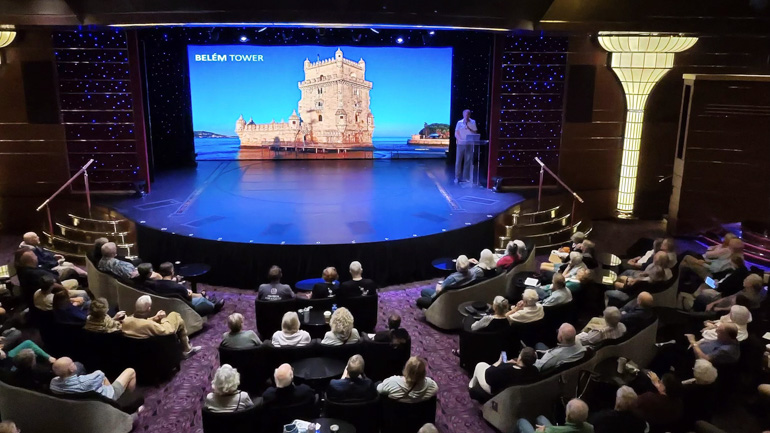 On our last sea day before Lisbon, I went to the port brief with Travel Guide Josh at 11 AM. The theater was full by 10:50. The 45-minute talk gave a solid overview, but recordings weren’t available yet pending subtitles and home-office approval.