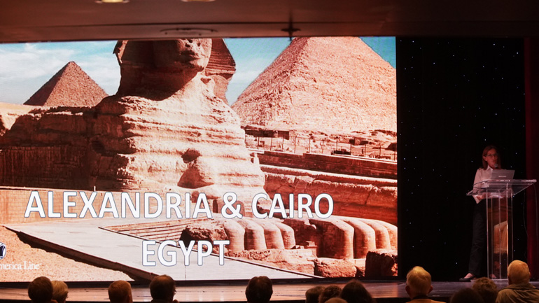 At 1 PM I stopped by the shore excursion talk. Even if you don’t book HAL tours, these sessions offer practical intel. We learned passports must be carried in Egypt and that coaches there travel with police escorts and armed guards.